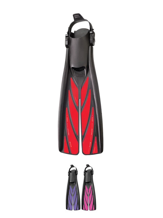 The Atomic Aquatics High Energy Split fins are available in Red, Pink and Purple.