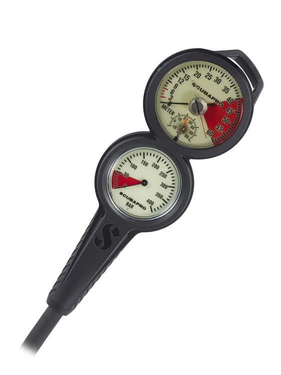 The Scubapro Compact SPG Twin holds the Scubapro Compct SPG. The SPG shows up to 400 BAR of pressure. The Scubapro Depth Gauge is oil-filled and uses the Bourdon Tube system to ensure you a detailed and trustworthy reading.Â