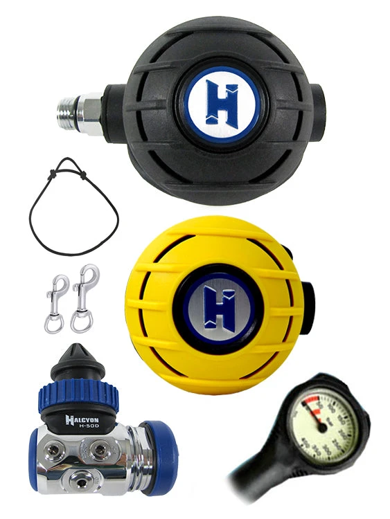High quality and functionality meets professional and efficient design. This regulator set from Halcyon consists of the H50D fist stage (DIN), the Aura second stage, an Aura Octopus and a free Termo Gauge.