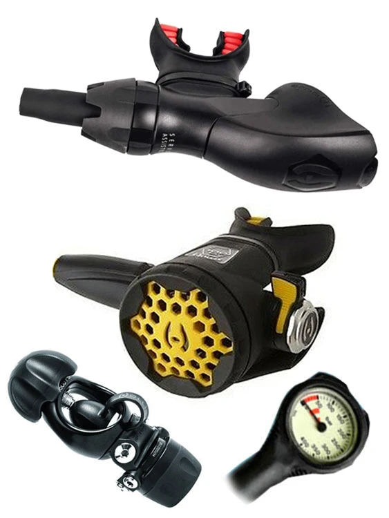 A great regulator set, for beginners and dive pros alike: the Hollis DC7 first stage + 500SE second stage + LX100 octopus & free termo gauge. This combo is especially useful in harsh dive environments.