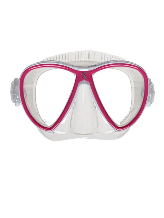 The scuba diving mask is available with a clear and a black silicone skirt, and three different colour options for frames (blue, pink, and red).