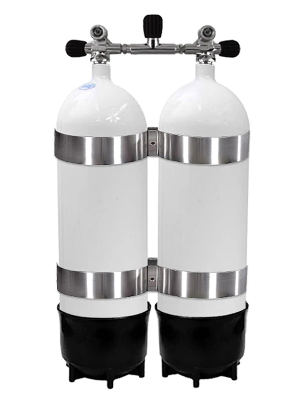 One of the most popular setups for tech diving, the manifolded 232 Bar Faber 12.2L twin cylinders with a standard 232 Bar DIN/Yoke Manifold! Extend your bottom time and increase your safety by using a twin tank set!
